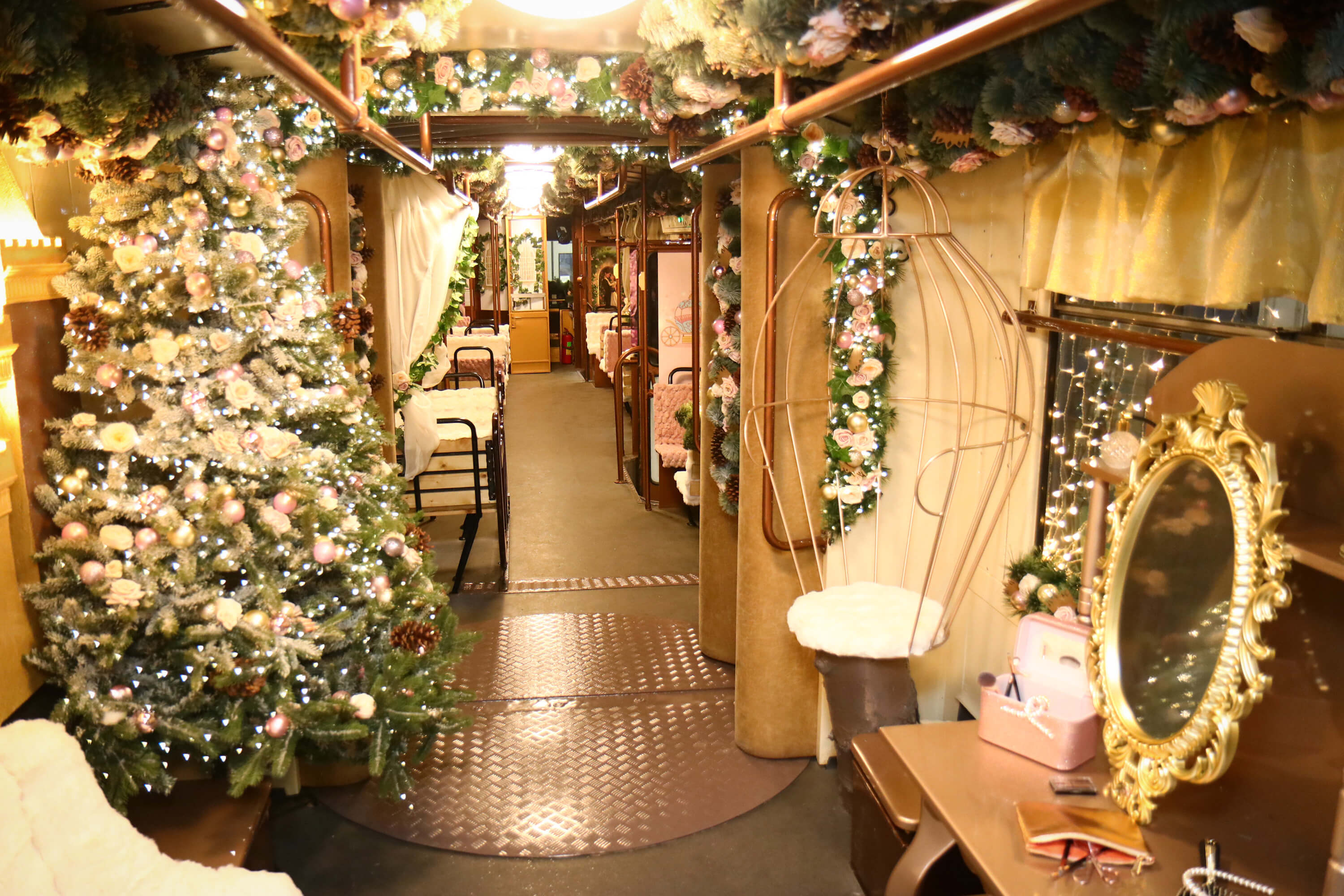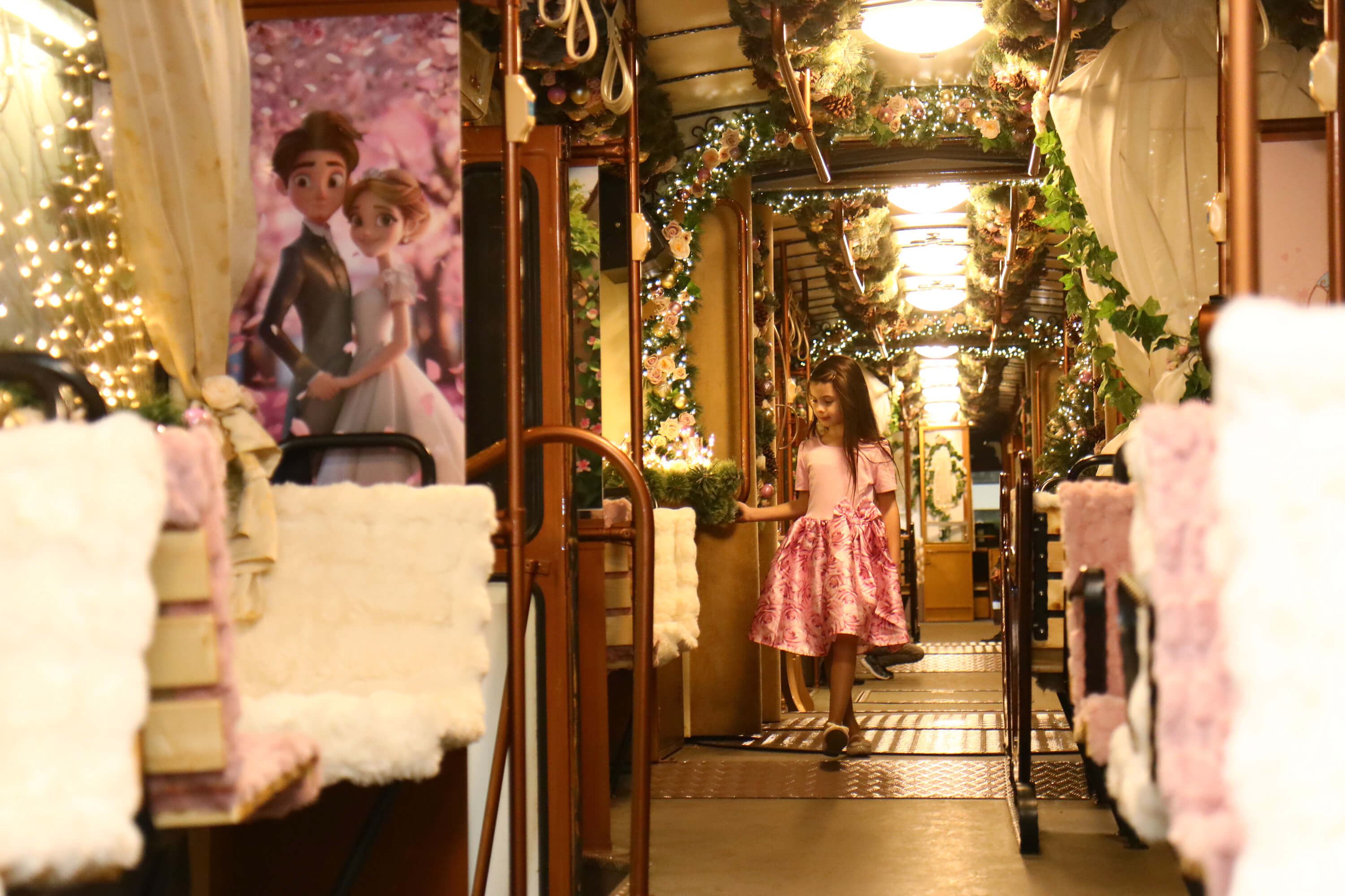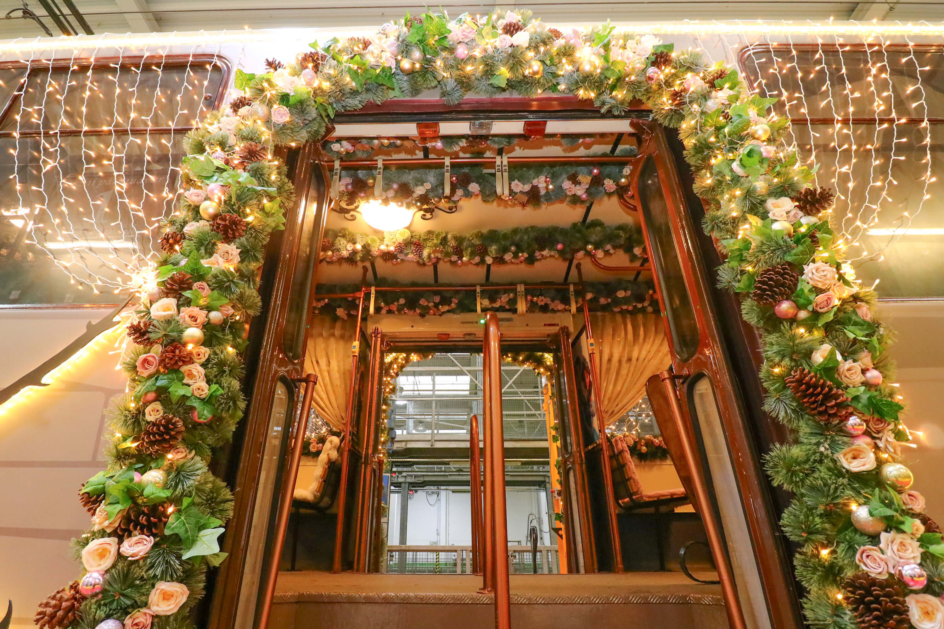 Inside, a starry sky with LED lighting, hundreds of Christmas decorations and hundreds of metres of decorative ribbons dressed the tram in festive state.
