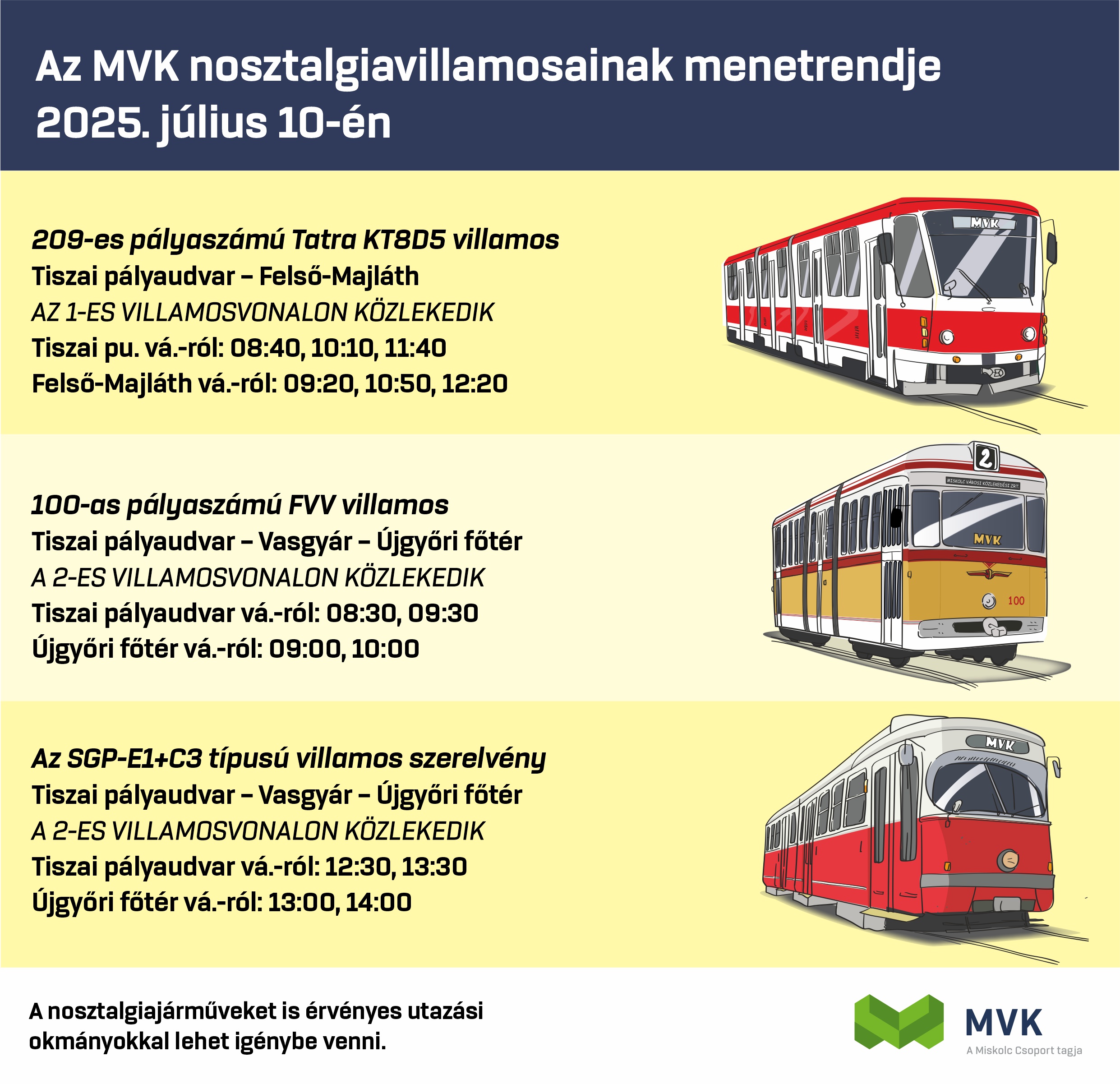 Csütörtökön, július 10-én ismét különleges járművek tűnnek fel Miskolc villamosvonalain: pályára állnak a város ikonikus nosztalgiavillamosai, köztük a piros „bécsi” (SGP) szerelvény és a 209-es Tátra villamos is.