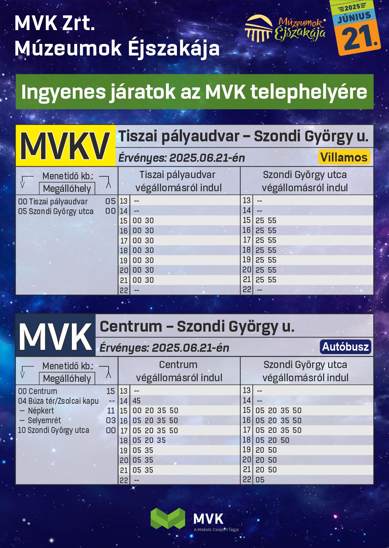 Az MVK Zrt. idén is gondoskodik arról, hogy mindenki könnyedén eljusson a Múzeumok Éjszakáján a közlekedési vállalat Szondi György utcai telephelyére! 2025. június 21-én, szombaton ingyenesen igénybe vehető különjáratok indulnak a Tiszai pályaudvar végállomásról és a Centrumtól, az alábbi menetrend szerint.