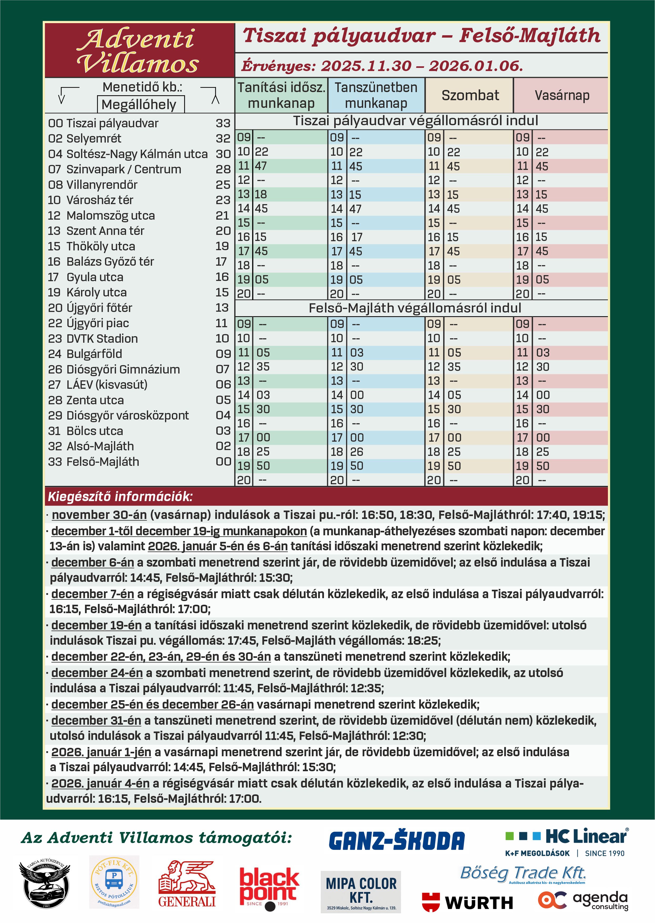 - december 6-án a szombati menetrend szerint jár, de rövidebb üzemidővel; az első indulása a Tiszai pályaudvarról: 14:45, Felső-Majláthról: 15:30;