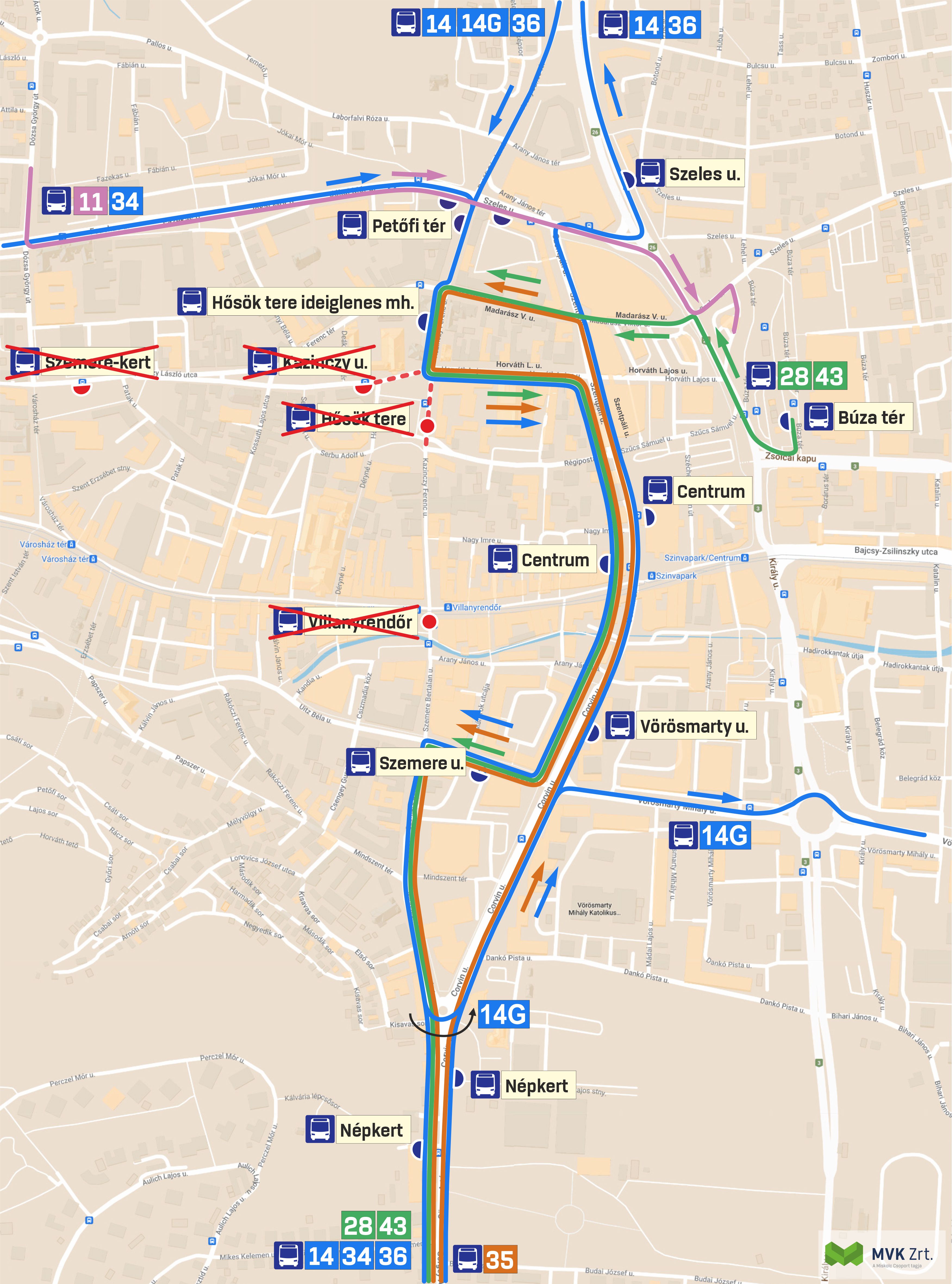 - A 34-es autóbuszjáratok az Avas kilátó irányában a Petőfi tér után a Földes Ferenc Gimnázium oldalában kialakított Hősök tere ideiglenes megállóhelyen, a Hejőcsaba irányú Centrum megállóhelyen (BOKIK épülete mellett) és a Szemere utca megállóhelyen állnak meg. A Népkerttől az útvonaluk és a megállóhelyeik változatlanok.