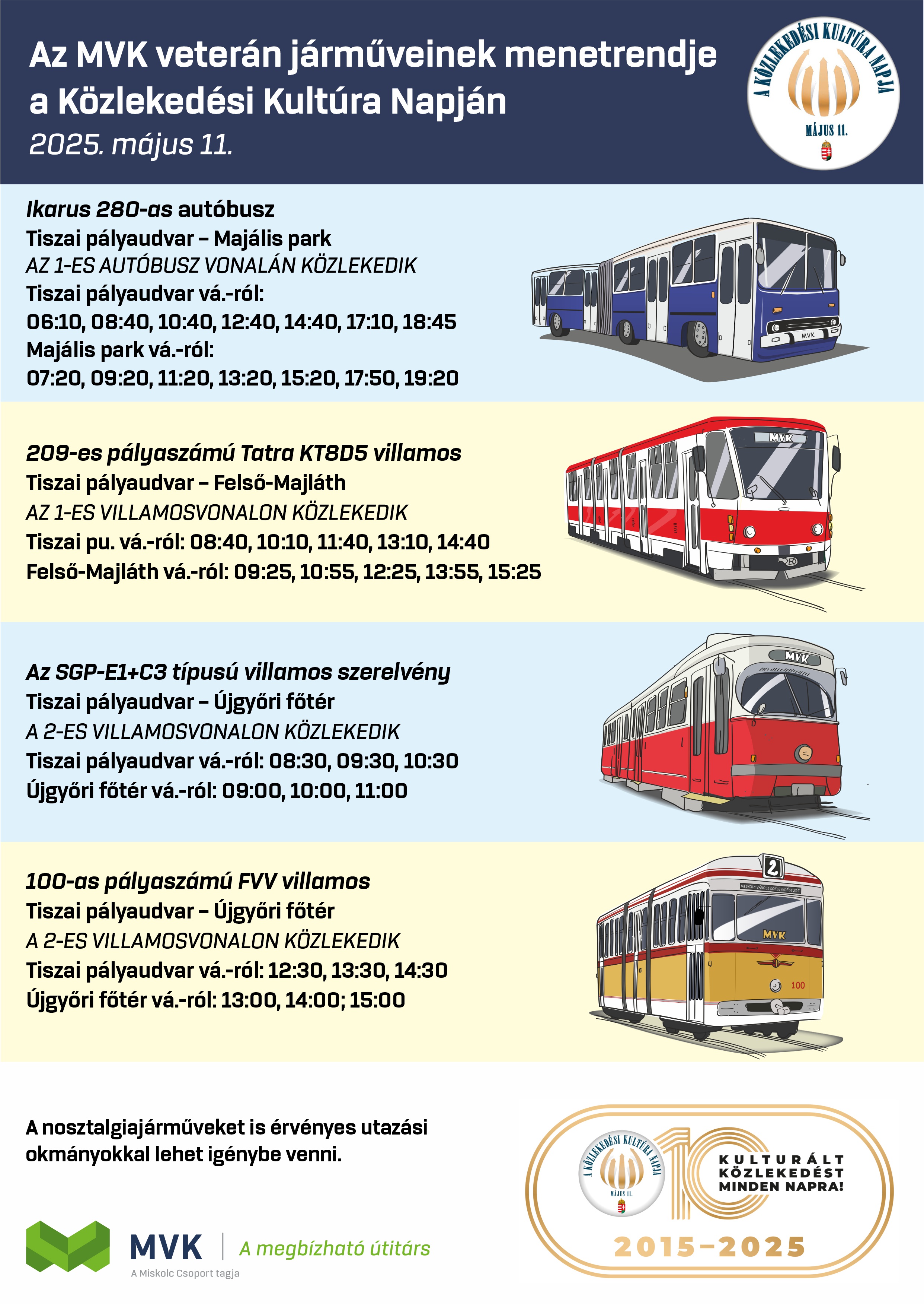 Az ünnep alkalmából május 11-én nosztalgiajáratokkal kedveskedik az MVK Zrt. a közlekedésbarátoknak és az érdeklődőknek. A városban közlekedik majd az Ikarus 280-as autóbusz, a Tatra KT8D5 és a 100-as FVV villamos, valamint az SGP-E1+C3 típusú szerelvény is.