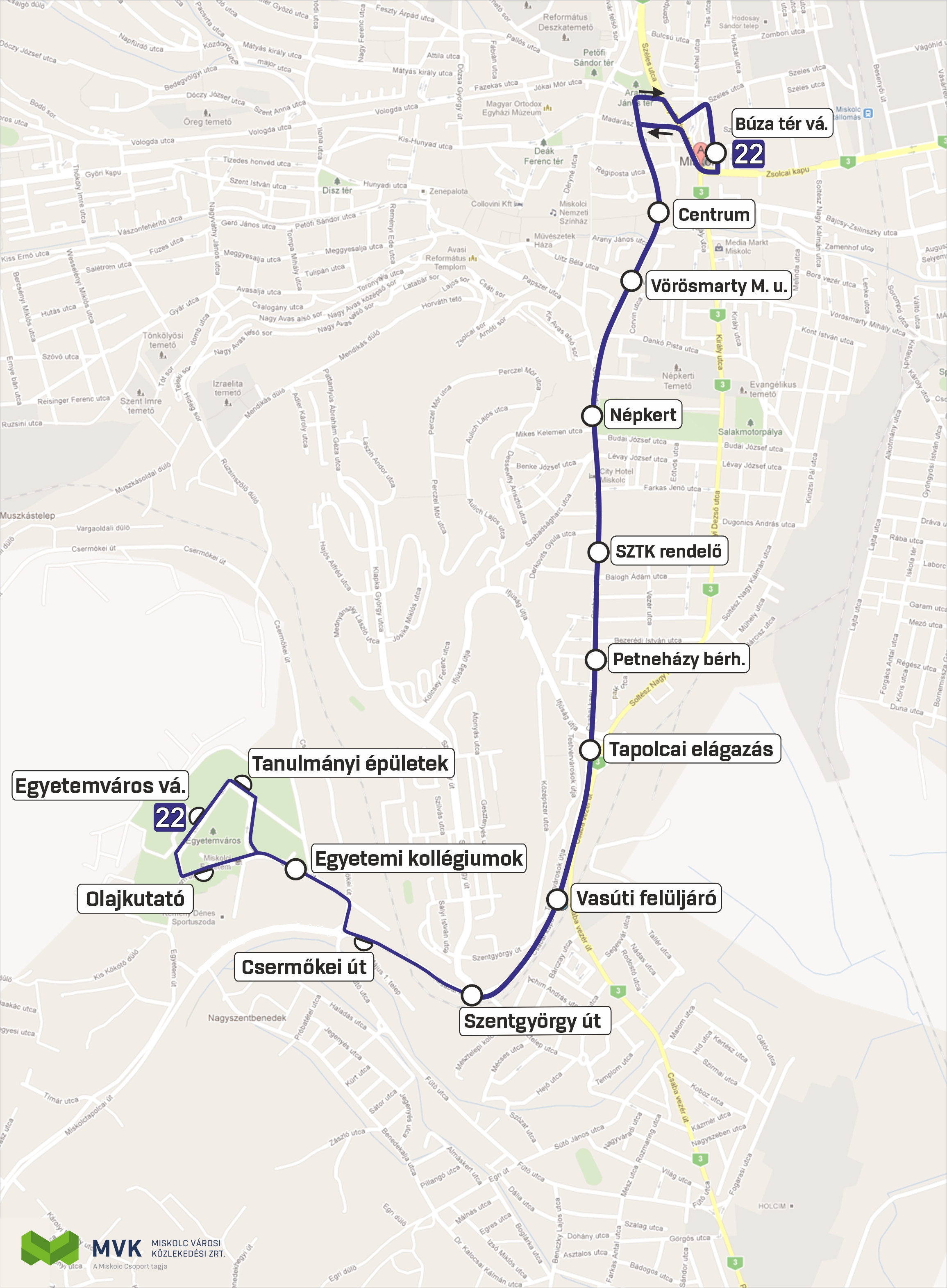 A Miskolci Egyetem kérésére a tavaszi szünet időtartama alatti munkanapokon, azaz április 17-én, csütörtökön és április 22-től április 25-ig, keddtől péntekig az MVK Zrt. rásegítő 22-es autóbuszjáratokat indít a Búza tér- és az Egyetemváros végállomások között az alábbi menetrenddel: