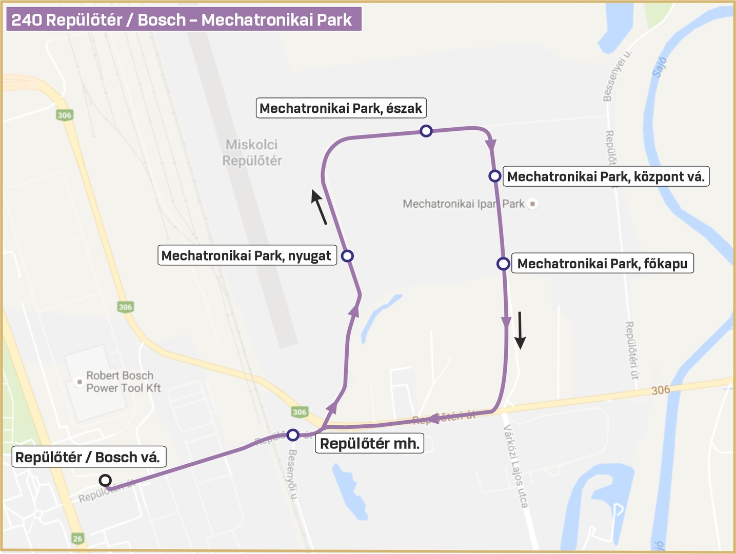 Szintén április 1-től, keddtől módosul a Mechatronikai Park, nyugat megállóhely elhelyezkedése a 240-es autóbuszvonalon: az eredeti helyszíntől kb. 200 méterrel közelebb kerül a Repülőtér megállóhely irányába. Emellett egy új megálló, Mechatronikai Park, észak kerül kialakításra, amely a Mechatronikai Park, központ végállomástól kb. 100 méterre, a Mechatronikai Park, nyugat irányába helyezkedik el.